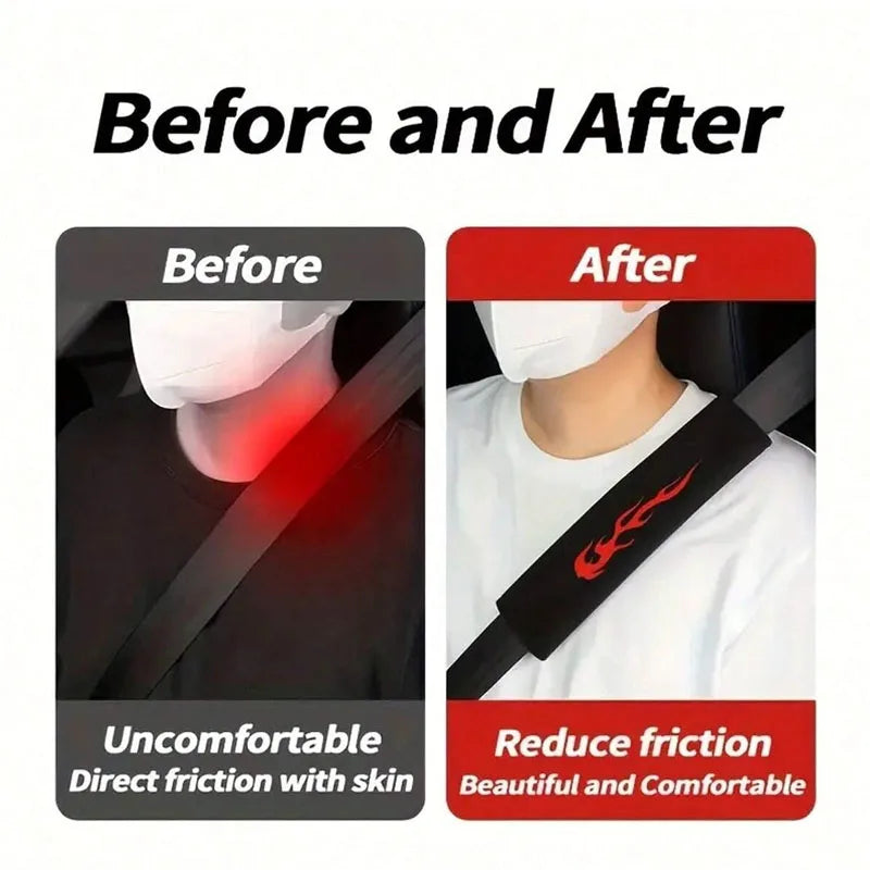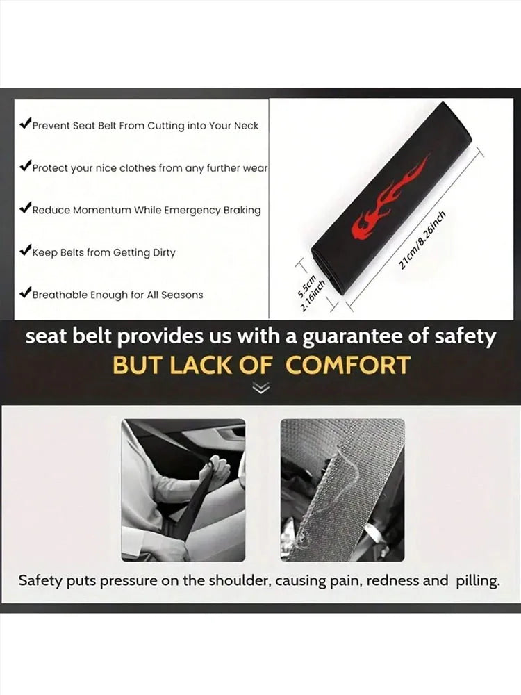 Enhance your driving comfort with these flame seat belt covers, designed with soft padding to reduce shoulder pressure and irritation. Featuring a sleek flame design, they add a sporty touch to your car interior. Easy to install and fits most vehicles.